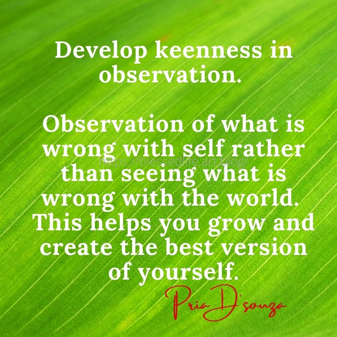 Develop keenness in observation Blessed soul quotes 22nd Oct 2021 1 Minute linkedin Pinterest instagram email Share on LinkedIn (Opens in new window) LinkedIn Share on Pinterest (Opens in new window) Pinterest Share on WhatsApp (Opens in new window) WhatsApp Like Loading... Related Published by Blessed soul I am a Life Coach.My redeemer is my Jesus. View all posts by Blessed soul Published 22nd Oct 2021